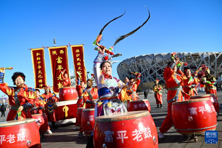 2月12日,表演者在“鸟巢”前进行老庙老鼓表演。