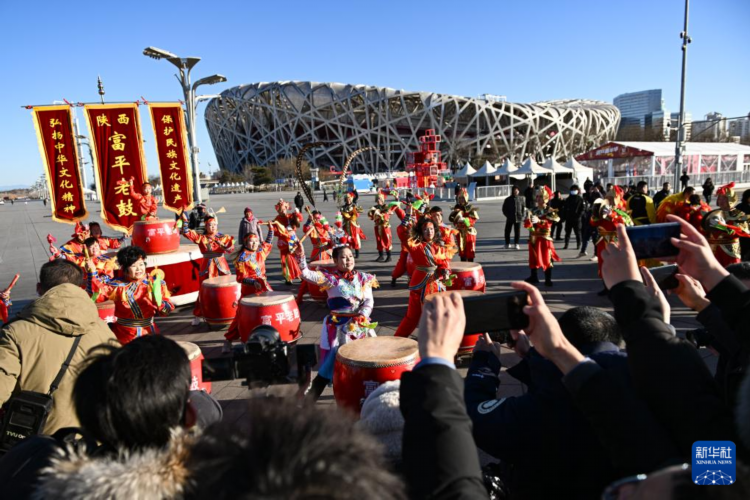2月12日,“鸟巢”前的老庙老鼓展演吸引众多游人观看。