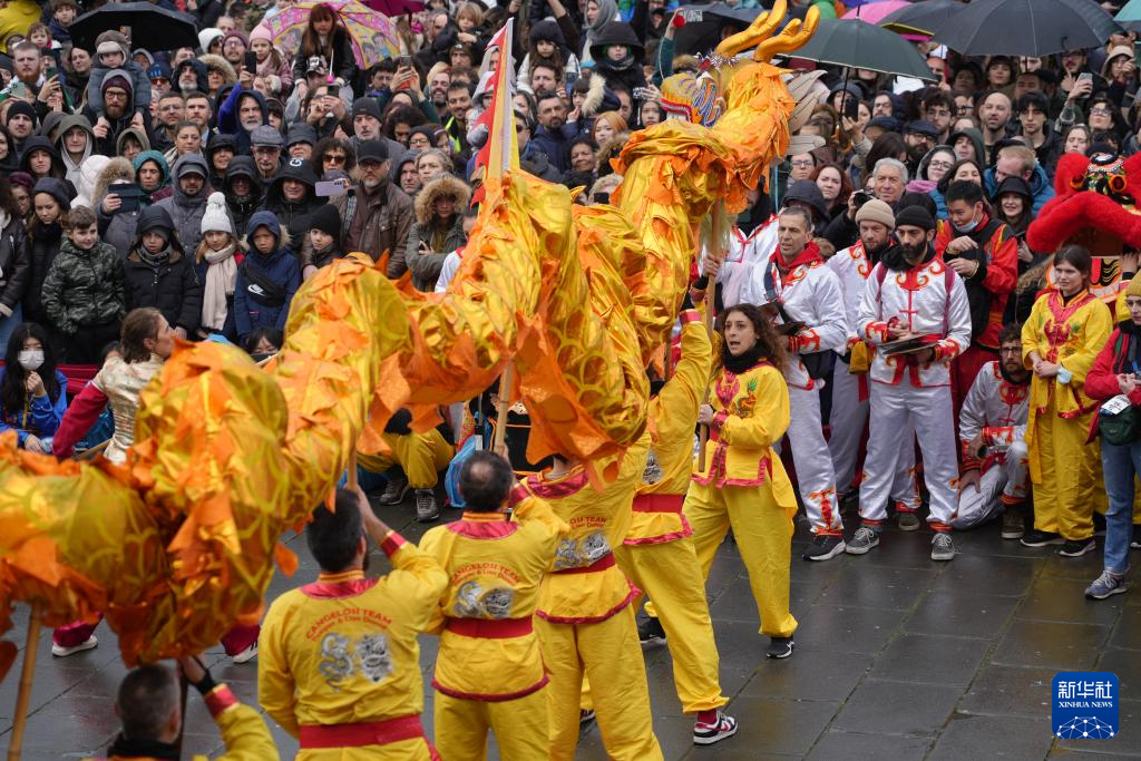 2月9日,在意大利普拉托举行的巡游活动上,演员表演舞龙。