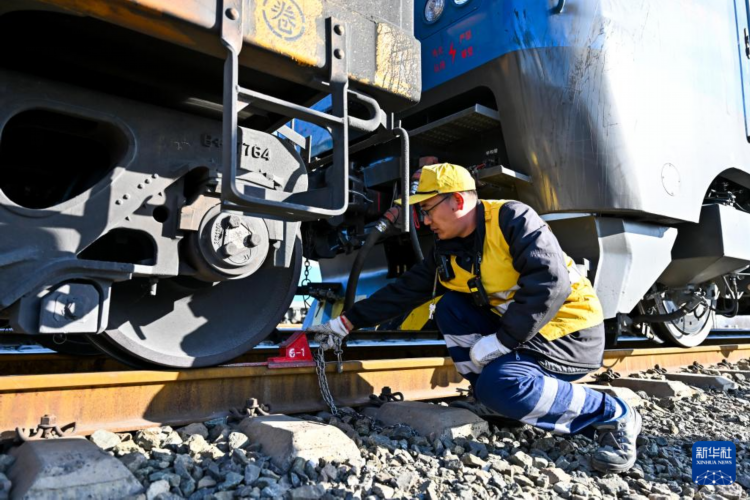2月13日,工作人员在呼和浩特南站给运煤列车放防溜铁鞋。