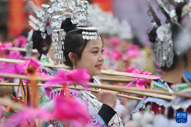 苗族姑娘在柳州市融水苗族自治县杆洞乡百鸟衣芦笙坡会上进行民俗展演(2月5日摄)。