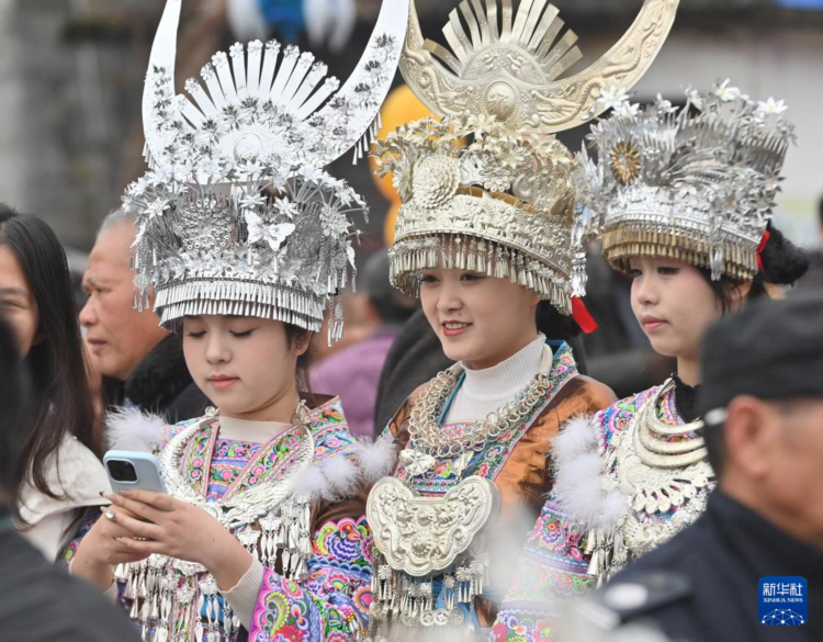 苗族姑娘参加柳州市融水苗族自治县香粉乡十六古龙坡会(2月13日摄)。