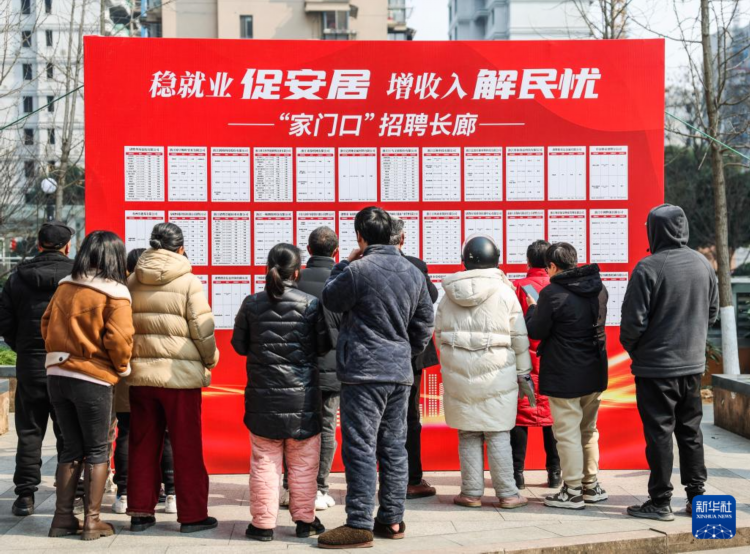 2月13日,公租房小区居民在查看专场招聘会推出的岗位介绍。