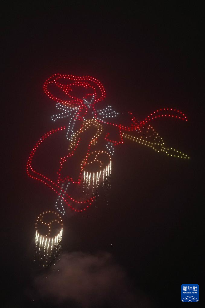 这是2月15日在湖南省浏阳市天空剧院拍摄的“春焰启幕 星耀浏阳”周末焰火秀无人机表演。