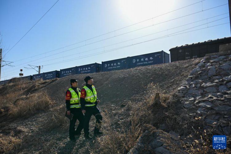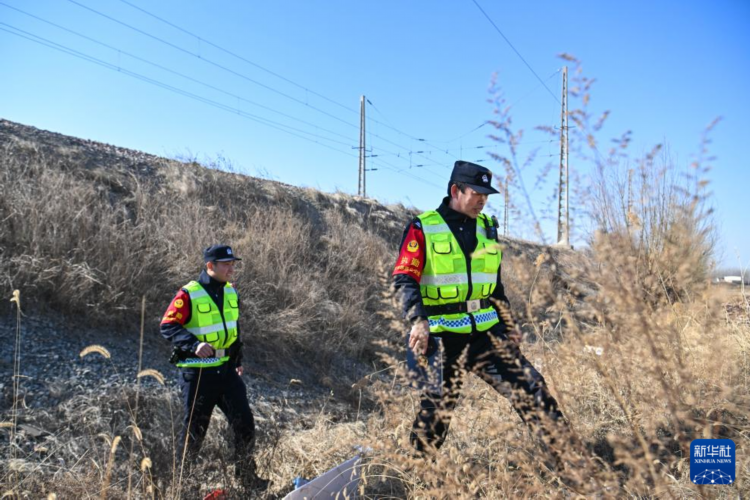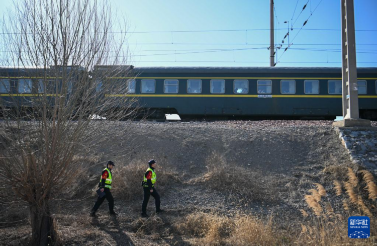 铁路线路民警刘文汉(左)与李亚鹏在值守辖区内巡线(2月13日摄)。