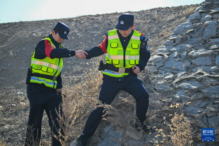 铁路线路民警刘文汉(左)与李亚鹏在值守辖区内巡线时通过一处陡坡(2月13日摄)。