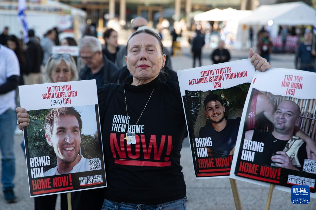 2月15日,在以色列特拉维夫一处广场,一名女子展示被扣押人员照片。