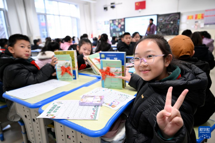2月16日,宁夏银川市兴庆区实验二小学生在展示领到的新课本。