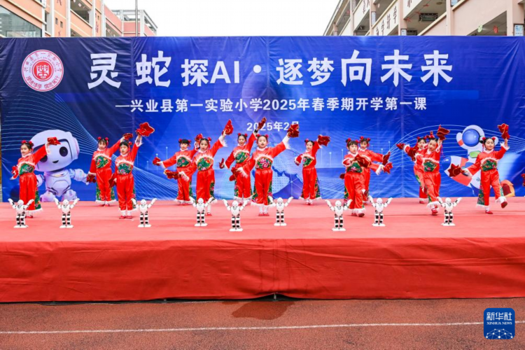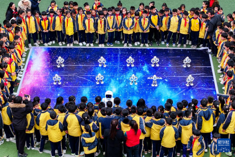 2月17日,在广西兴业县第一实验小学,学生们与机器人共舞。