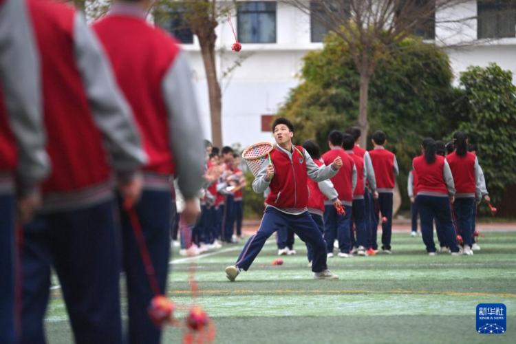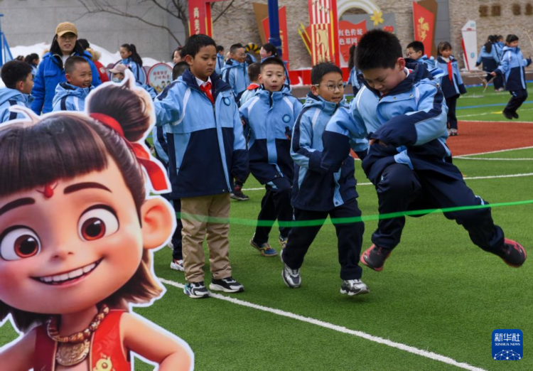 2月17日,学生们在乌鲁木齐市第十三小学操场上进行趣味游戏。