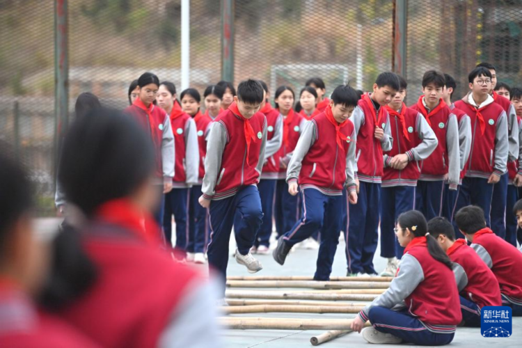 2月17日,广西梧州市开展“求实创新共成长,团结筑梦向未来”开学第一课主题活动。这是在梧州市第十四中学学生在跳竹竿舞。