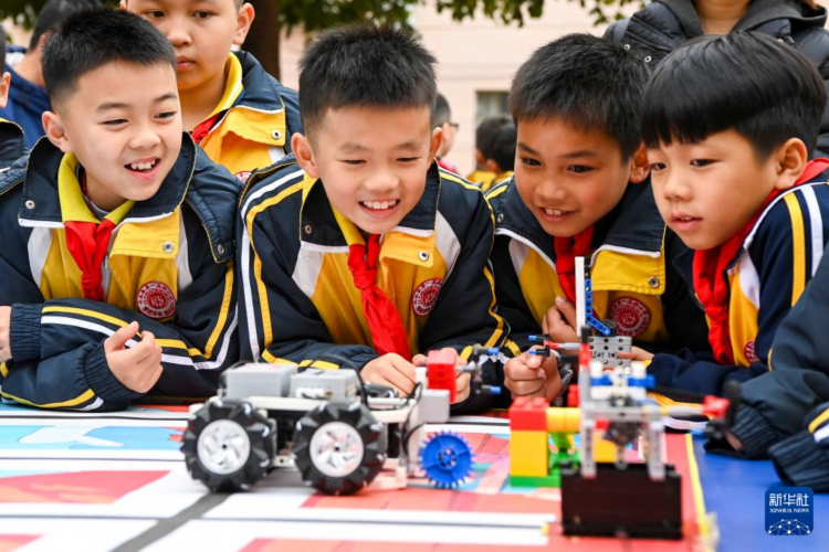 2月17日,在广西兴业县第一实验小学,学生们通过智能编程操控机器车。