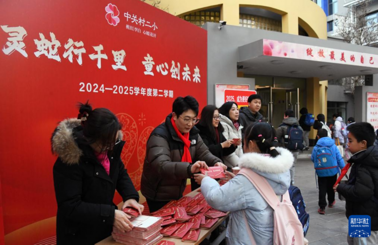 2月17日,在北京市海淀区中关村第二小学(华清校区),老师为学生发放装有新学期寄语的“成长红包”。