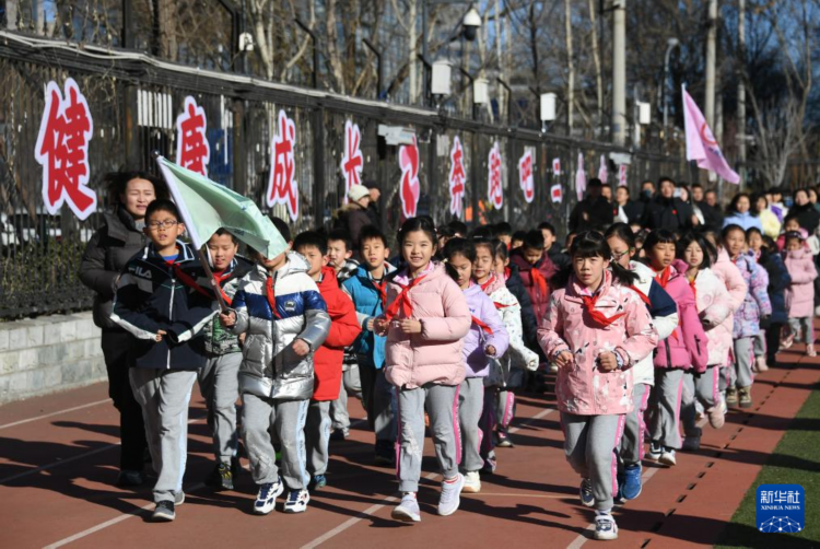 2月17日,在北京市海淀区中关村第二小学(华清校区),学生参与“阳光跑”活动。