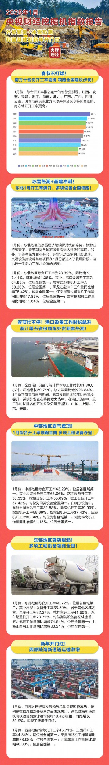 最新数据显示,1月份,虽然受春节节假日临近、企业员工集中返乡等因素影响,全国各项基建项目逐渐放缓,但受冰雪经济和外贸交易带动,多地和多类机械设备开工率上涨。