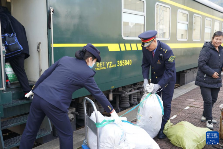 2月17日,6064次列车工作人员帮助乘客将农产品搬运上火车。