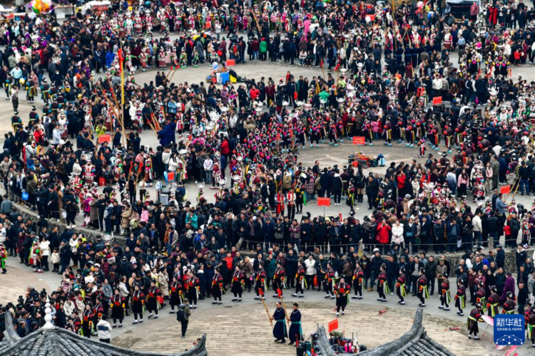 这是2月16日拍摄的贵州省凯里市舟溪镇“甘囊香”芦笙节活动现场(无人机照片)。