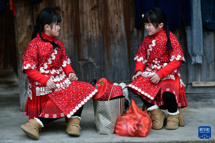 在贵州省凯里市舟溪镇舟溪村茶林苗寨,长辈在帮助双胞胎姐妹杨柠羽(左一)、杨柠竹(左三)穿戴苗族盛装(2月15日摄)。