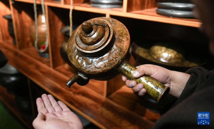 “牧人宝库”藏式茶馆收藏的用于熬化酥油的铜壶(2月13日摄)。