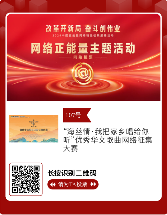 近日,由中央网信办主办的2024中国正能量网络精品征集展播活动启动了网络展播投票。投票结果将作为中国正能量网络精品遴选的重要参考。在展播投票名单中,“海丝情·我把家乡唱给你听”优秀华文歌曲网络征集大赛入围网络正能量主题活动 (融合组)单元,编号107,投票时间为2025年02月15日至2025年02月21日,每个ID同一作品每天可投一票。
