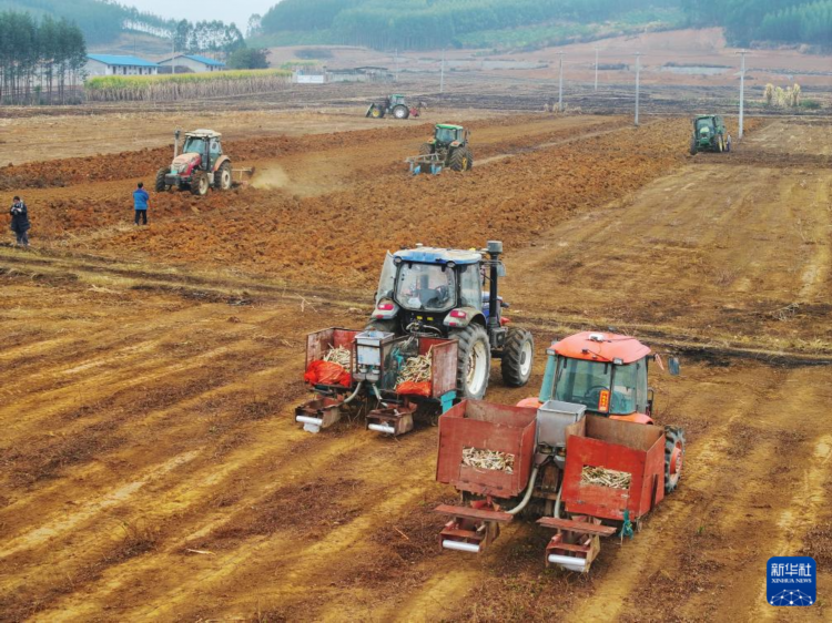 2月19日,在广西来宾市兴宾区凤凰镇国家现代农业产业园黄安优质“双高”糖料蔗基地,农民驾驶农机在田间作业(无人机照片)。