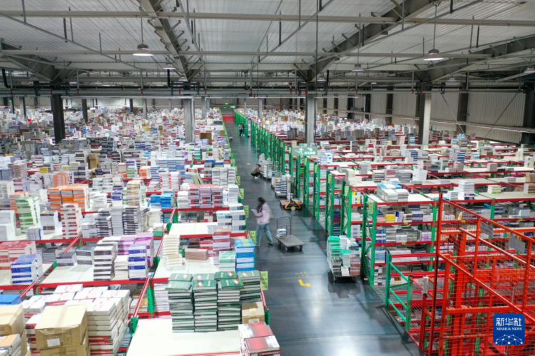 2月19日,工作人员在图书仓库内整理书籍(无人机照片)。
