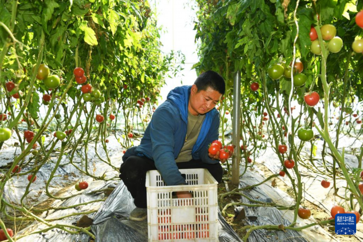 2月20日,工作人员在北京市平谷区峪口镇的北京秾秾生态农场采摘西红柿。