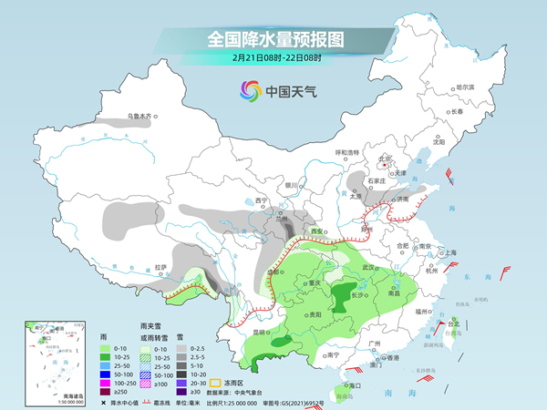 未来三天(2月21日至23日),南方阴雨天气较多,西南、江南等地有小到中雨,局地大雨。同时,西藏东南部雨雪频繁,部分地区有大雪,需注意防范。受冷空气和雨雪影响,我国大部地区气温将陆续降至近期低点,江南等地天气湿冷,公众请注意保暖。