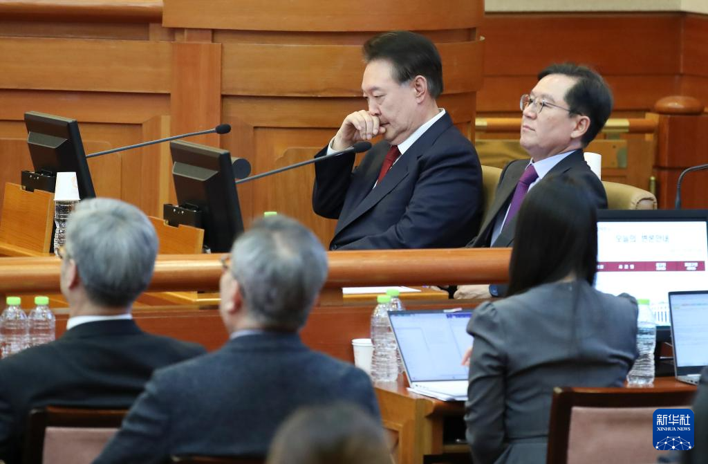 2月20日,尹锡悦(中)在韩国首尔宪法法院出席总统弹劾案庭审。