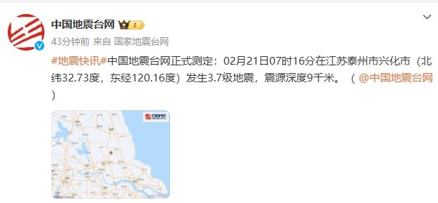 中国地震台网正式测定:2月21日7时16分在江苏泰州市兴化市(北纬32.73度,东经120.16度)发生3.7级地震,震源深度9千米。