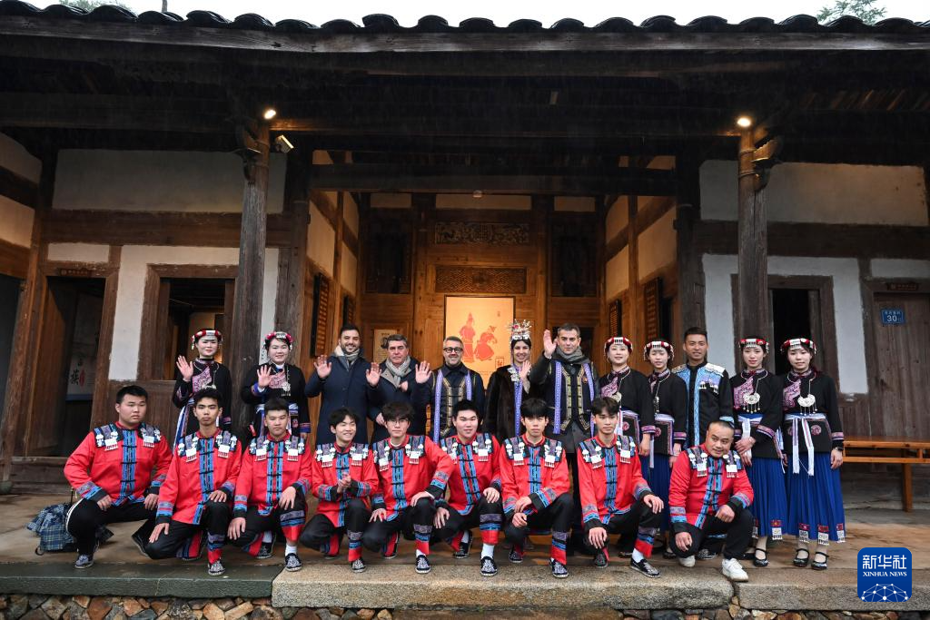 2月20日,意大利客人在霞浦县溪南镇半月里村参观拍照。 当日,前来福建省宁德市霞浦县参加青少年足球培训及文化旅游合作项目签约仪式的意大利撒丁大区代表团一行,来到溪南镇畲族古村落半月里村,体验畲族服饰,参与制作畲乡美食,观看畲族婚俗、武术、山歌等表演,沿途感受古村风貌,浓浓的畲乡风情和热情好客的畲族群众给远方的客人留下深刻印象。 新华社记者 姜克红 摄