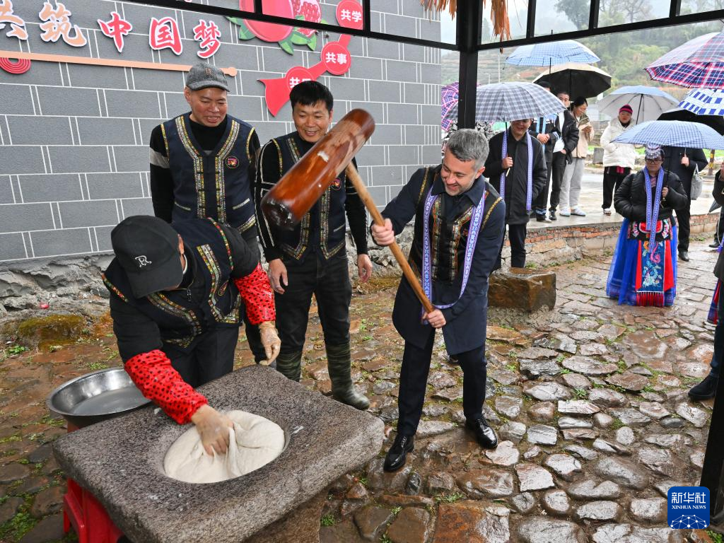 2月20日,意大利客人在霞浦县溪南镇半月里村体验打糍粑。 当日,前来福建省宁德市霞浦县参加青少年足球培训及文化旅游合作项目签约仪式的意大利撒丁大区代表团一行,来到溪南镇畲族古村落半月里村,体验畲族服饰,参与制作畲乡美食,观看畲族婚俗、武术、山歌等表演,沿途感受古村风貌,浓浓的畲乡风情和热情好客的畲族群众给远方的客人留下深刻印象。 新华社记者 姜克红 摄