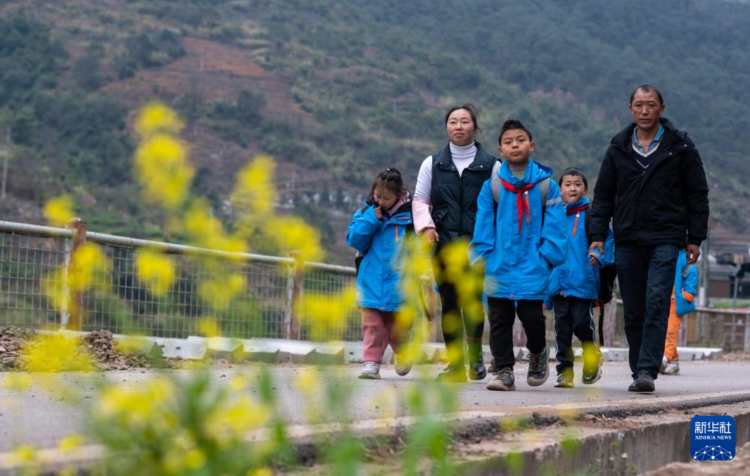 2月23日,云南省宣威市普立乡尼珠河村的小学生们准备出发去学校。