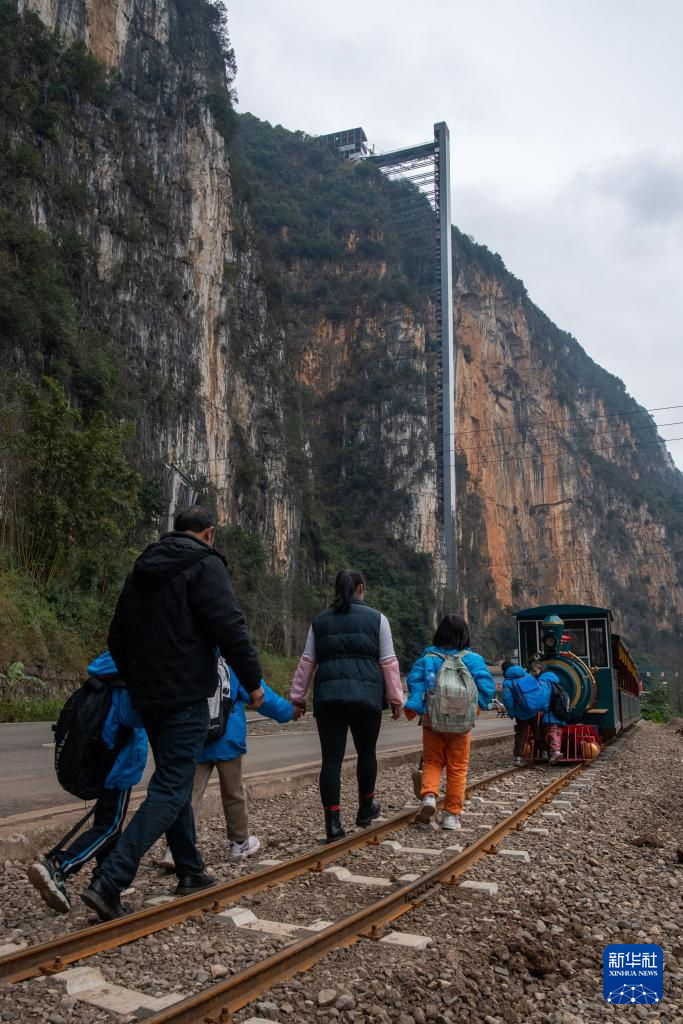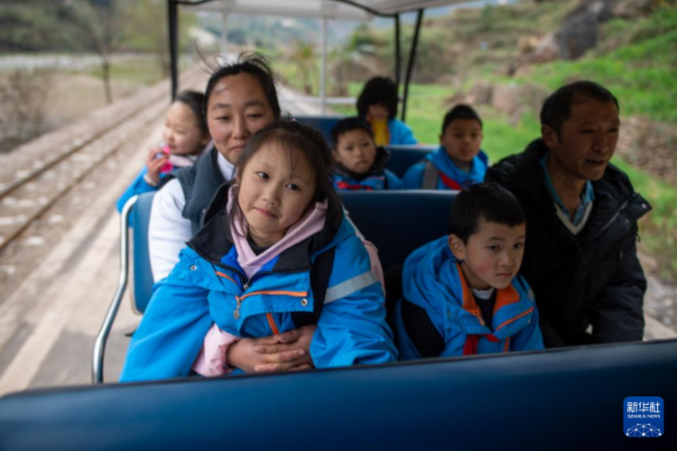 2月23日,云南省宣威市普立乡尼珠河村的小学生们在家长的带领下乘坐景区观光车。