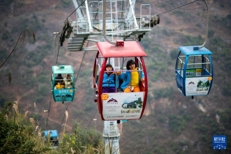 2月23日,云南省宣威市普立乡尼珠河村的小学生们乘坐空中缆车去学校。
