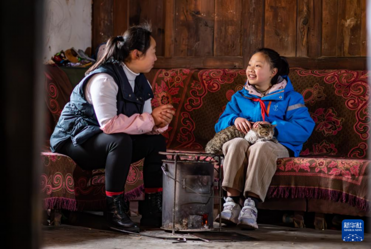 2月23日,云南省宣威市普立乡尼珠河村的小学生陈泓函出发前在家跟妈妈聊天。