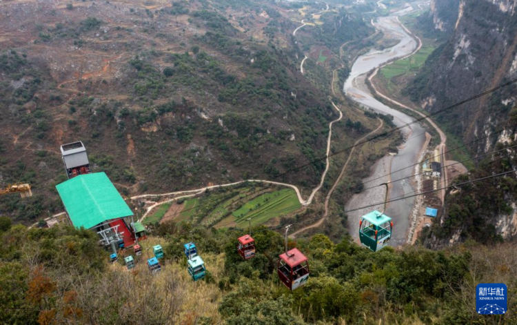 2月23日,云南省宣威市普立乡尼珠河村的小学生们乘坐空中缆车去学校(无人机照片)。