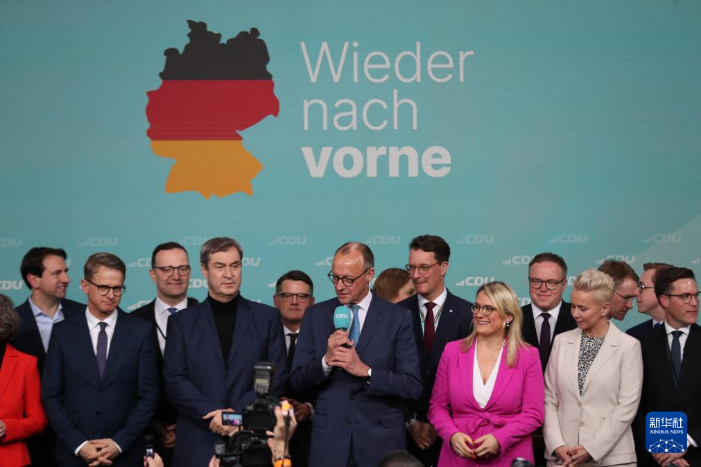 2月23日,在德国柏林的基督教民主联盟总部,联盟党总理候选人默茨(中)在出口民调显示领先后接受祝贺。