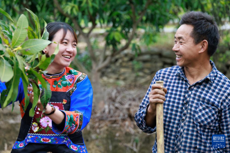 在镇宁布依族苗族自治县六马镇致富村,卢丹(左)与村民刘发志交流芒果种植情况(2025年2月20日摄)。