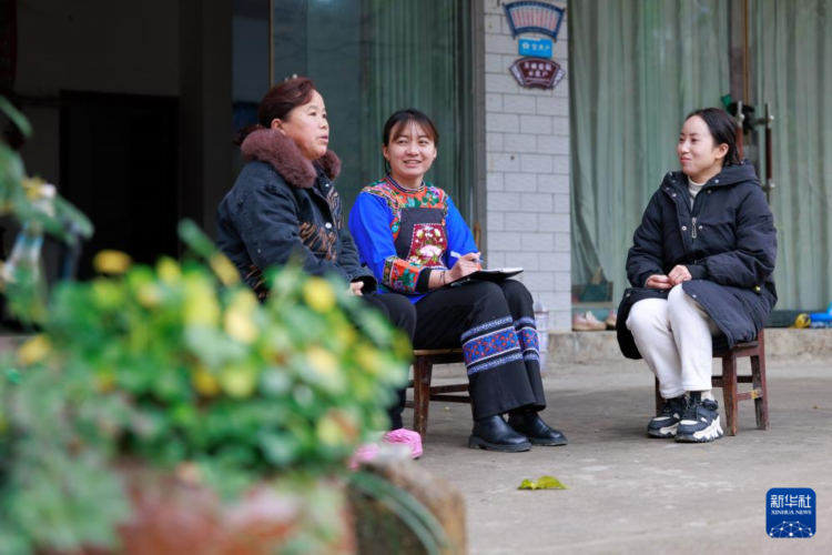 在镇宁布依族苗族自治县六马镇致富村,卢丹(中)在村民卢成敏(左)家调研蜂糖李种植情况(2025年2月20日摄)。