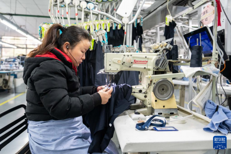 2月24日,在沅江高新区服装产业园一家制衣企业,工人在生产服装。
