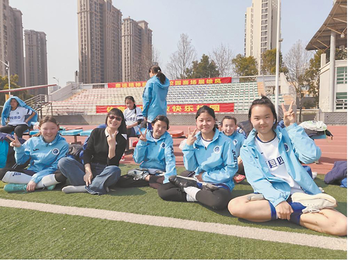 许少娟(左前二)和呼图壁四中的女足队员在一起。