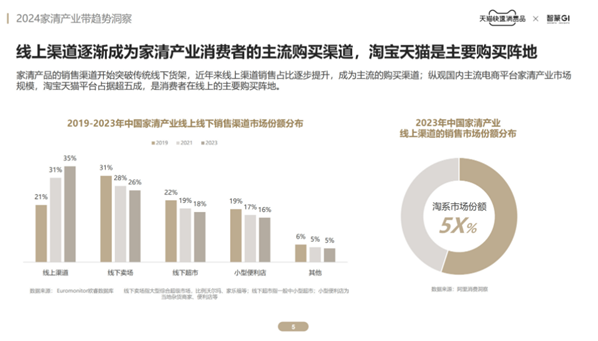 据淘天集团与研究咨询服务机构智篆GI联合发布的《2024家清产业带趋势洞察》,家清产品的销售渠道开始突破传统线下货架,线上渠道销售占比逐步提升,成为家清产业消费者的主流购买渠道。