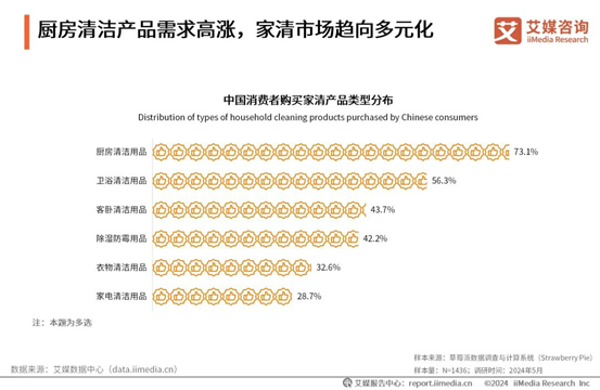 据艾媒咨询发布的《2024年中国家清产品消费趋势洞察报告》,在家庭清洁产品的购买偏好调查中,厨房清洁用品以73.1%的高比例位居首位,卫浴清洁用品和客卧清洁用品各占56.3%和43.7%。