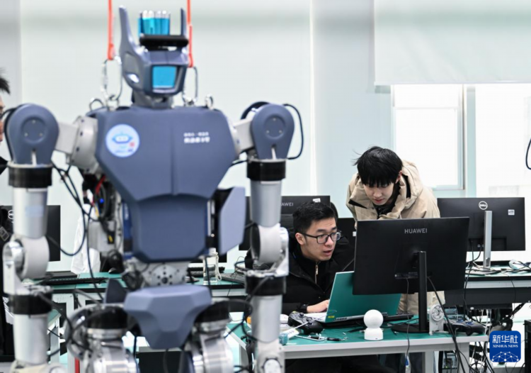 2月24日,在武汉格蓝若智能技术股份有限公司,研发团队成员在调试人形机器人。