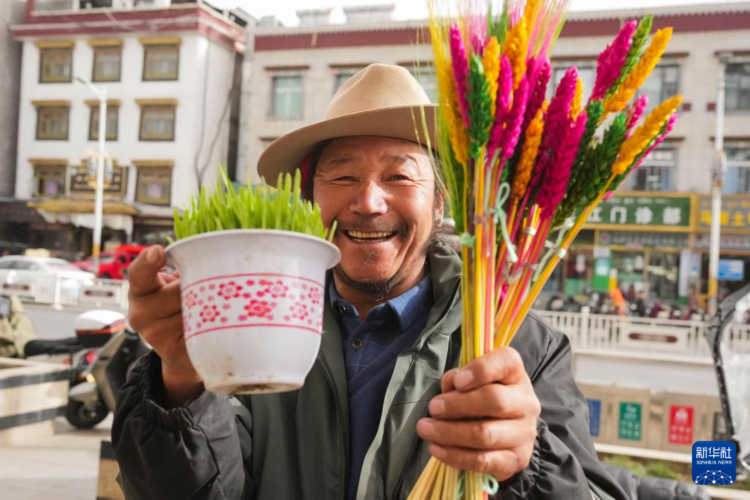 2月24日,商贩在拉萨街头售卖青稞苗和新年饰物。