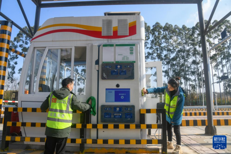 2月25日,在成南高速扩容工程淮州新城收费站,工作人员在清洁收费岗亭。