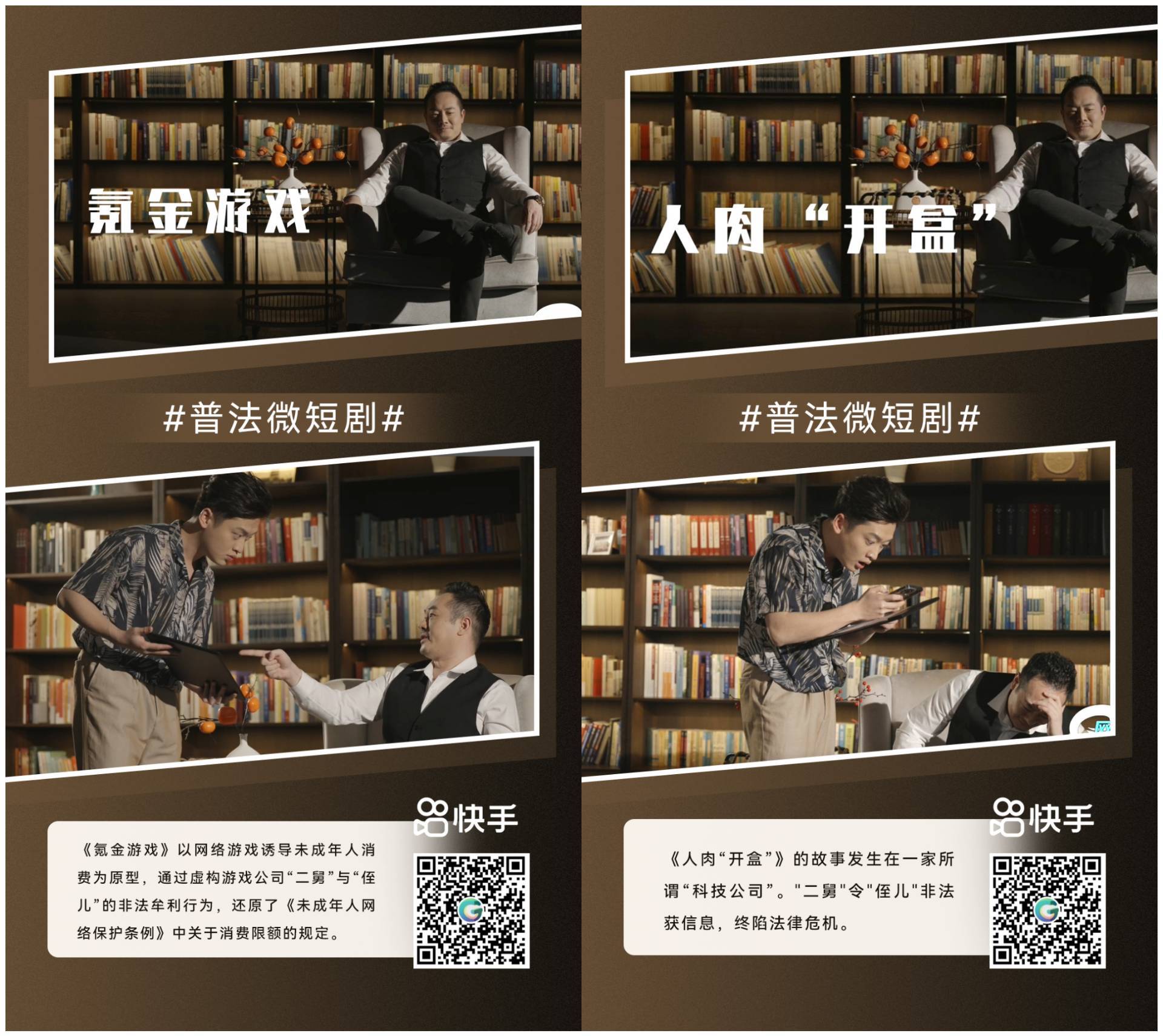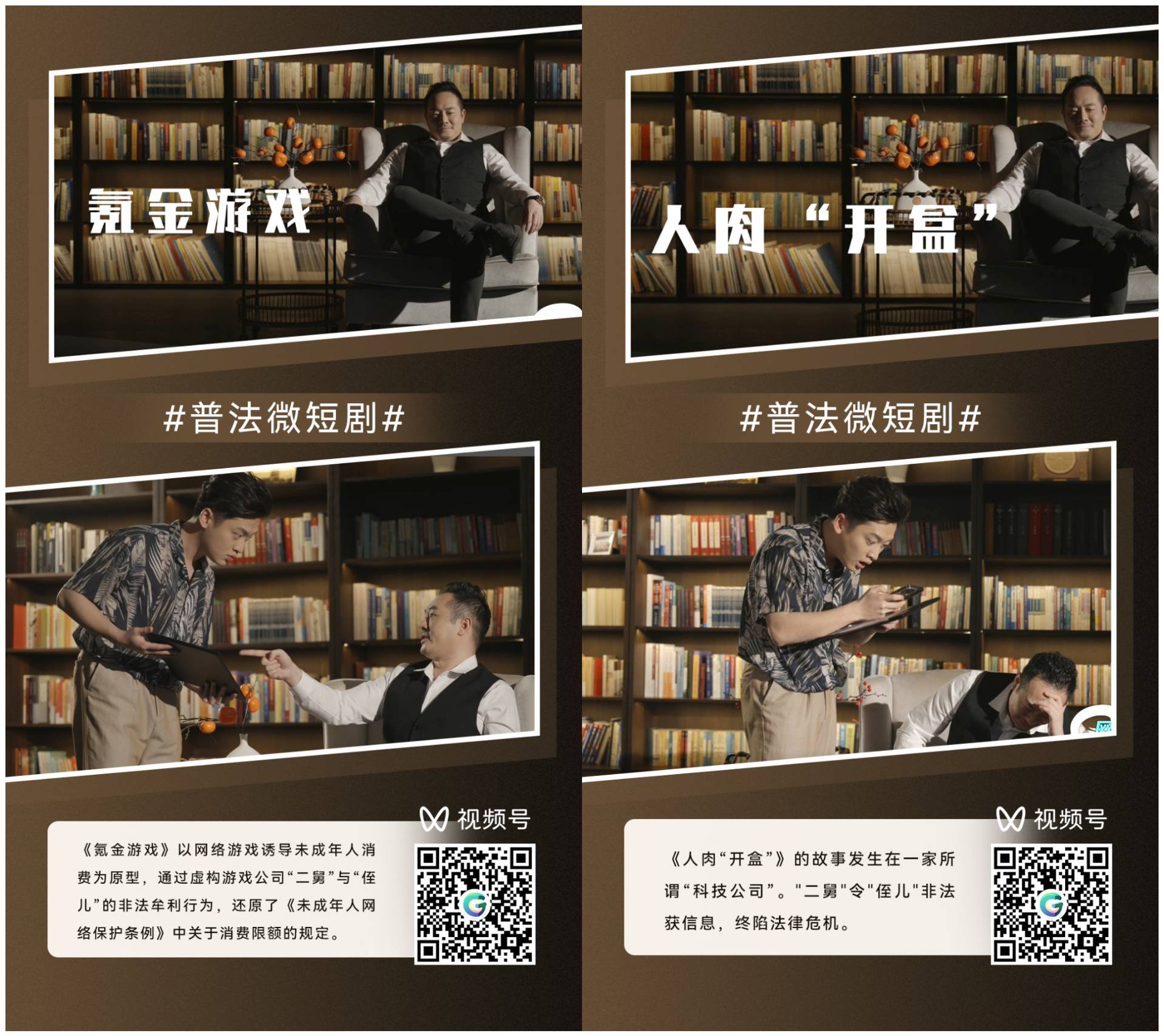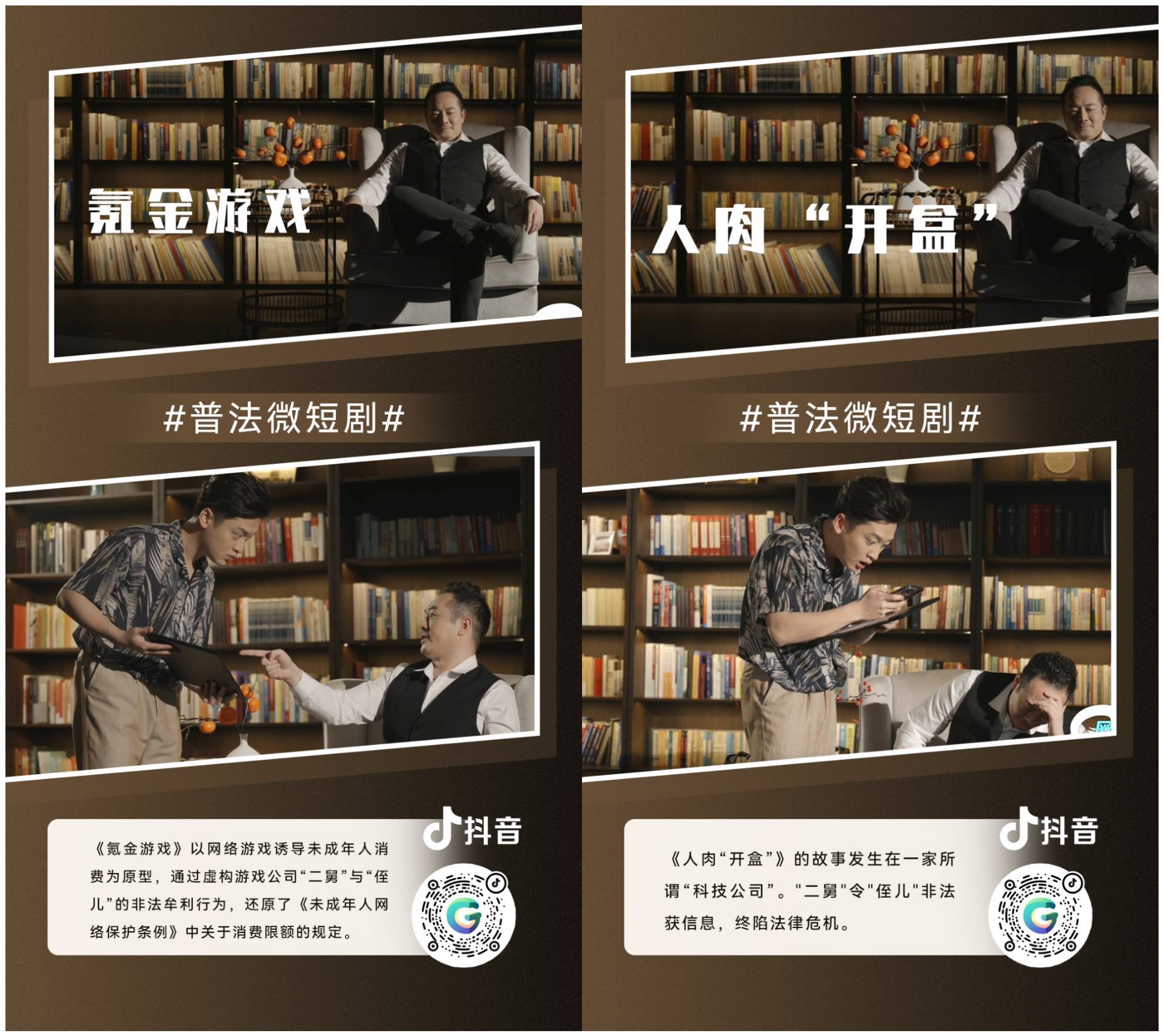 《人肉“开盒”》聚焦于个人信息泄露的社会问题。剧中,一家科技公司的老板“二舅”为扭转业绩下滑,让员工“侄儿”非法获取用户信息,最终引发一系列危机并面临法律制裁。该剧的剧情提示网友们,个人信息泄露可能导致个人隐私被侵犯,不仅人们的生活受到干扰,甚至还会引发社会不稳定,全社会都应当要重视个人信息保护。而《氪金游戏》则关注网络游戏中的未成年人过度消费问题。剧中,一家游戏公司在利益驱动下,设下氪金诱惑,诱导玩家尤其是未成年人消费,甚至收集玩家个人信息建立私域数据库。随着监管部门的介入,这场游戏“陷阱”最终被揭开。该剧通过“剧情+法条”的形式,视频呼应了近年来有关部门开展的“清朗·暑期未成年人网络环境整治”专项行动,向网友科普了应对网络游戏乱象如何保护未成年人的相关法律知识。