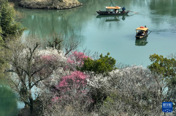 2月26日,游客乘坐摇橹船在杭州西溪湿地赏梅(无人机照片)。