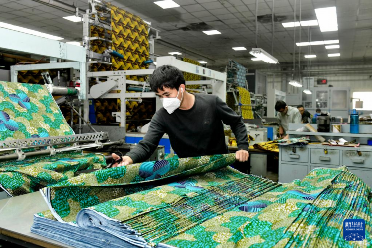 2月25日,在愉悦家纺有限公司蜡染车间,工作人员在裁剪出口非洲的布匹。